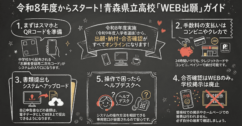 皆さん、こんにちは。八戸で一人ひとりに寄り添う個別指導の塾、学習塾Rootです。この記事では、令和9年度入学者選抜(令和8年度実施)から始まる青森県立高校のWeb出願...